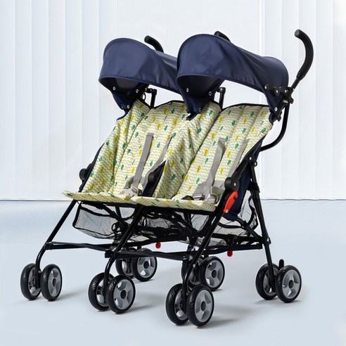 블랙 컬러의 쌍둥이 아기 유모차는 두 아이를 동시에 편안하게 태울 수 있는 구조에 접이식 프레임으로 보관과 이동이 편리하고 시내 산책이나 여행에 적합하며 안전벨트와 선캡으로 안전과 그늘을 제공하고 바퀴의 회전과 서스펜션으로 부드러운 주행감을 느낄 수 있다.